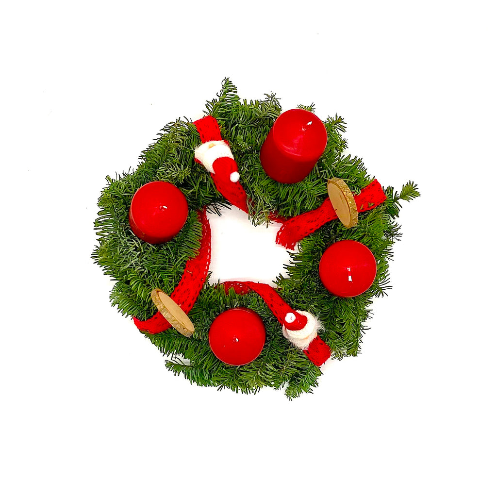 Corona de abeto natural, decorada en tonos rojos para llenar de luz tu casa en Navidad.